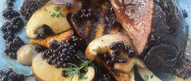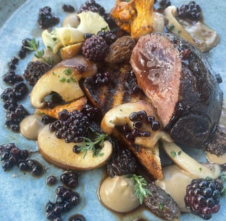 An autumnal show stopper bringing together earthy mushrooms, hedgerow fruits elderberries & brambles and the rich gamey flavour of venison liver. Page 90